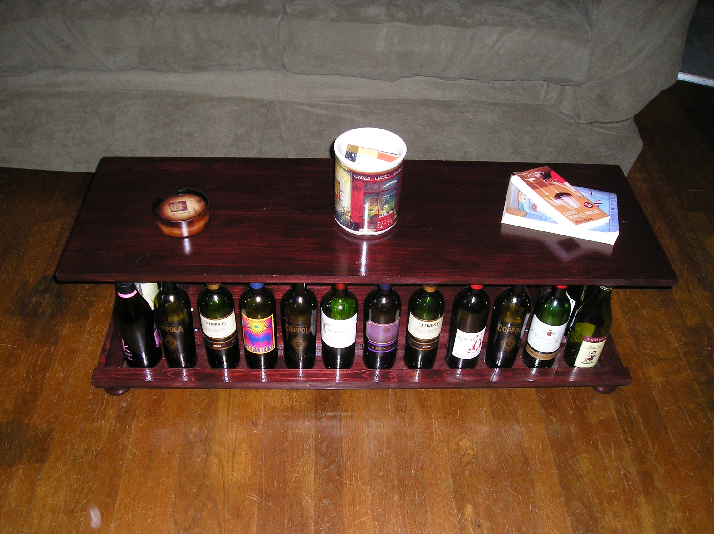 Inspired by posts across the Internet, created a wine bottle coffee table.